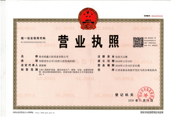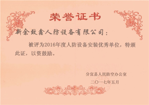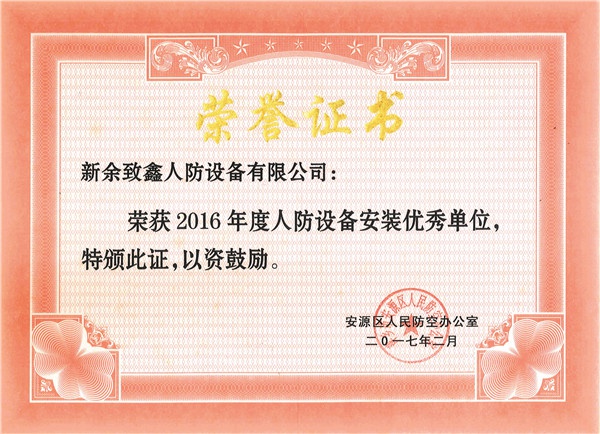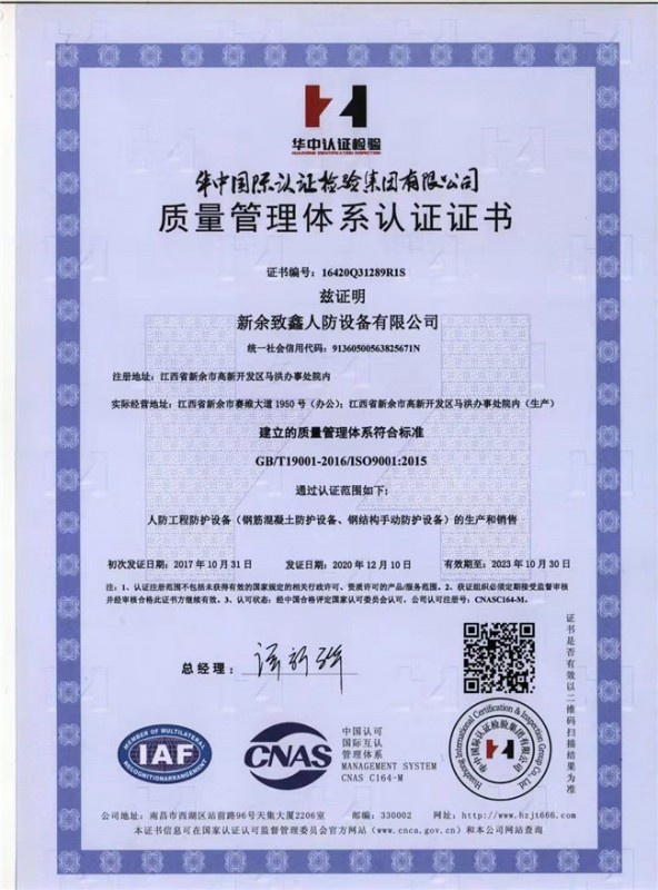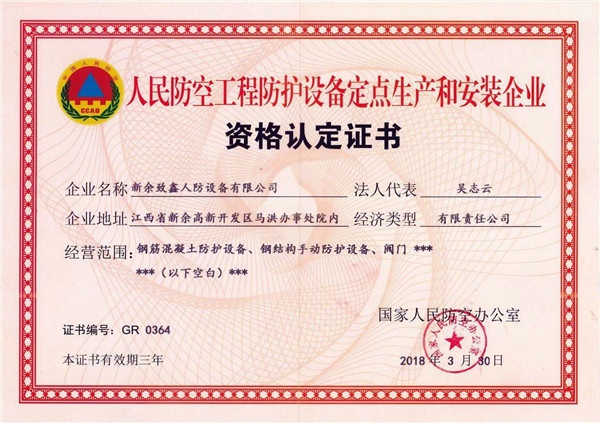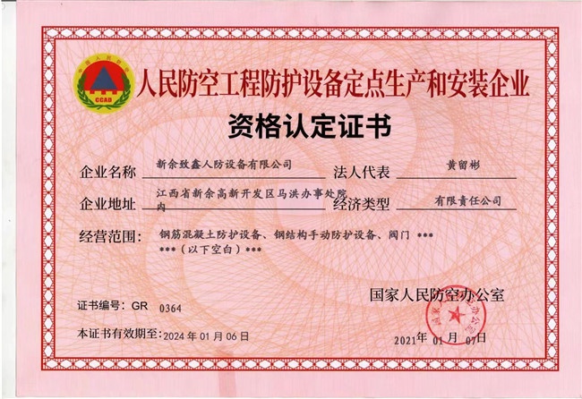 江西省新余致鑫人防设备有限公司位于中国江西工业重要城市—新余,是经国家人民防空办公室批准的人防工程防护设备定点生产和安装企业(证书编号:国人防办厂字246号),同时也是通过ISO9001认证的人防工程设备公司。